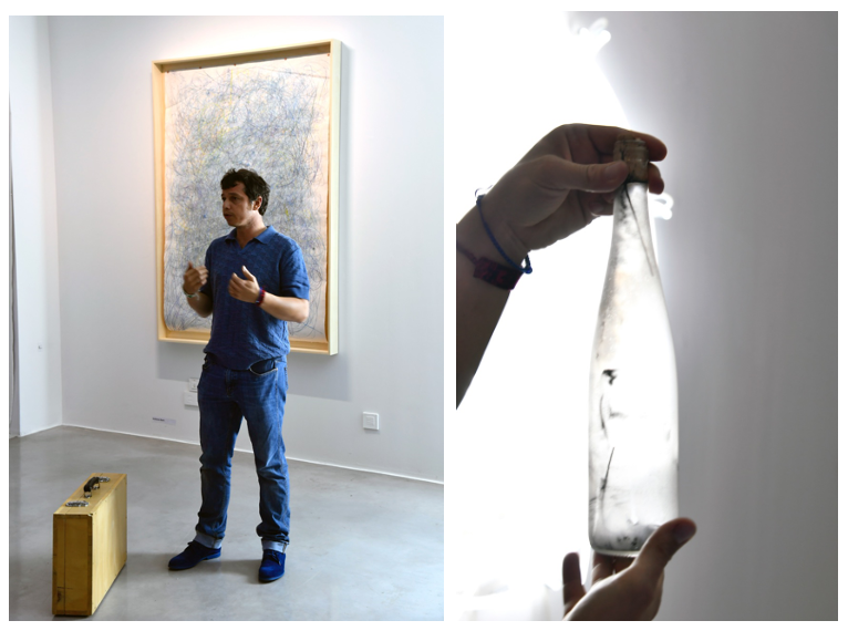 Car une fois les œuvres finies d’accrochées, l’exposition a révélé un paysage global constitué aussi de configurations qui n’avaient été ni programmée, ni prévues. Avec même d’étonnantes révélations issues de synchronicité visuelles, formelles ou symboliques, qui donnent à l’ensemble toute sa cohérence, sa dynamique et son sens. Aussi bien sur les plans visuels, plastiques et muséographiques, que sur celui des symboliques, de leur énergétique et de leur portée métaphysique. Ce qui n’était pas gagné, et même assez risqué, vu la diversité et le nombre relativement important d’œuvres présentées à mettre en symphonie. Une dimension oraculaire qu’a d’ailleurs activée Guillaume Barth dès l’ouverture de l’exposition, avec une performance mettant en œuvre un processus d’émission et d’interprétation de volutes de fumées collectés dans une bouteille. Tel un auspex qui tenterait de déchiffrer le vol des oiseaux ou les volutes des nuages dans le carré de ciel qu’il vient de dessiner dans les airs avec son bâton. Ou un haruspice qui tente de lire dans les entrailles de ses victimes pour en tirer des présages.