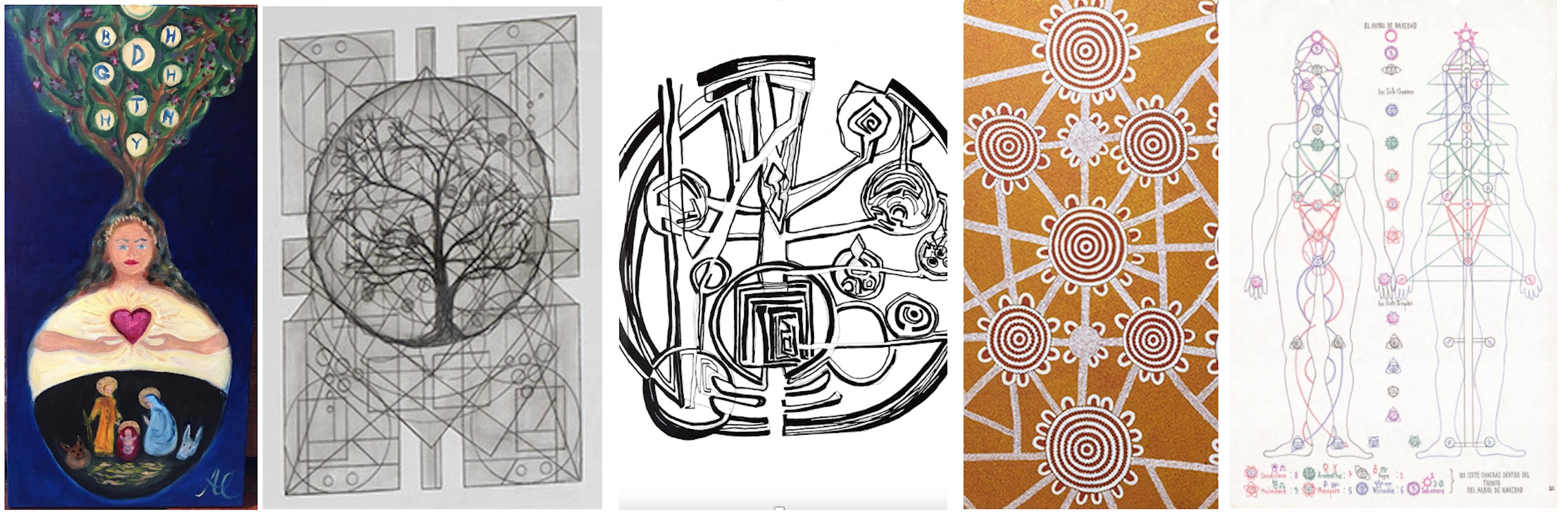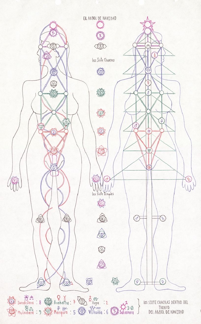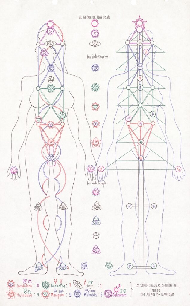 S’il est une œuvre qui exprime ce parcours de vortex et de chakras c’est bien celle de l’artiste brut Carlos Augusto Giraldo. Avec un petit dessin positionné entre les nuages d’art brut et d’art aborigène. Intitulé « El arbol de navidad », (l’arbre de noël), il montre deux corps féminins stylisés avec les indications des chakras surimposés au plan de l’arbre de vie de la kabbale inscrit dans le corps l’humain. Et dont les rouelles des sephirots correspondent à celles des chakras. On peut s’étonner du titre « arbre de noël » et non pas « arbre de vie ». Cela est vraisemblablement dû à une référence à la tradition du moyen-âge de « l’arbol del paraiso », qui condensait les symboliques de l’arbre de la connaissance du bien et du mal avec celle de l’arbre de vie. Tout en associait les figures d’Adam et Eve. Ce que semble reprendre Giraldo avec les deux corps humain-arbres. A la différence près qu’il semble s’agir de deux représentations féminines.