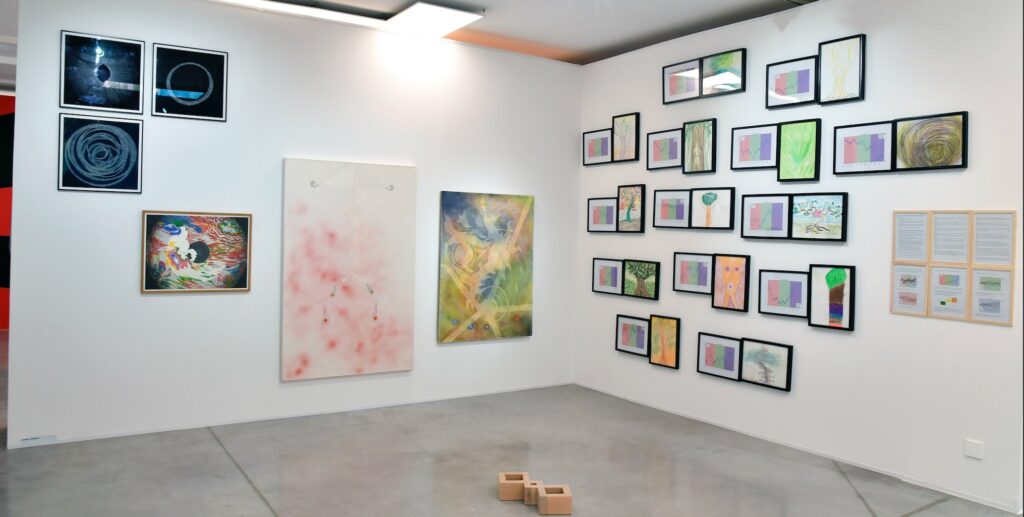 Le dessin des cosmogrammes, comme l’arbre ou la fleur de vie, voire le mandala, qui ont inspiré plusieurs artistes de l’exposition, ne sont pas que des représentations schématiques de l’univers. Ils guident aussi la place que l’humain peut y prendre. Ils lui donnent du sens, une mission, une raison de vivre. Ces schémas aux formes géométriques compartimentées sont à la fois des outils de représentation et d’inscription dans le cosmos, mais également de connexion à ses multiples dimensions. Ils permettent par exemple de faire jonction entre ses plans visibles et invisibles. Ils ont également une dimension énergétique associée à un parcours infra et métacognitif. Ce sont des outils de connaissance dont le fonctionnement et la fonction débordent la raison de la culture occidentale moderne. Ils peuvent être véritablement actifs à partir d’une forme d’organicité biologique et naturelle.