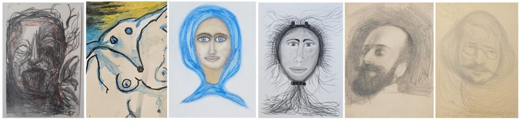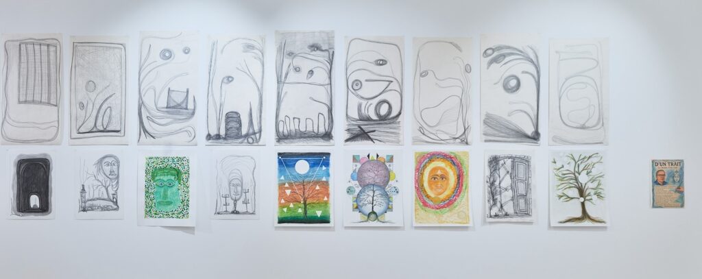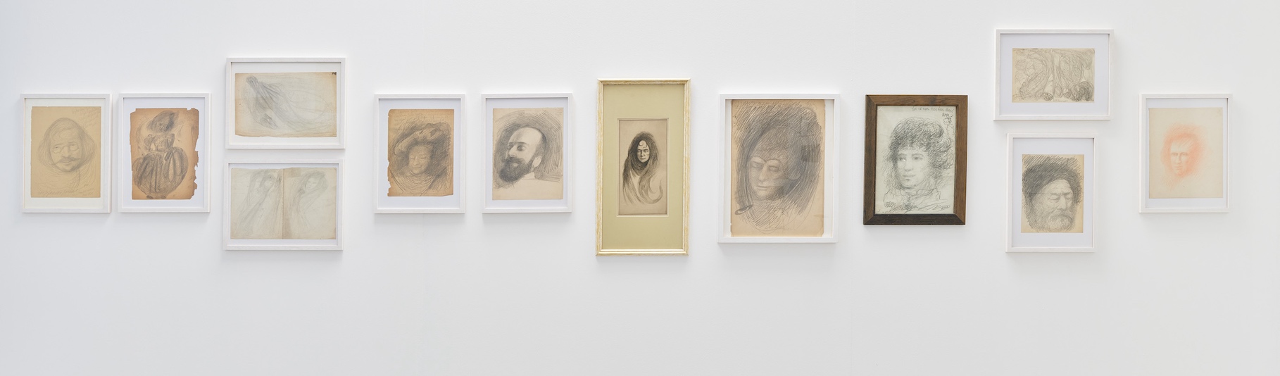 Une autre caractéristique de l’exposition qui n’avait été ni préméditée, ni même envisagée est l’apparition au fil du parcours d’une véritable galerie de portraits où cohabitent des visages de personnes existantes ou imaginaires, qui peuvent prendre les traits de trépassés ou d’autres entités. Des défunts qui peuvent même s’adresser au dessinateur et au visiteur, comme c’est le cas pour Fernand Desmoulin et Philippe Deloison, deux grands représentants de l’art spirite opérant à un siècle de distance, où le dessin des figures que l’on peut qualifier d’inspiré, est associé à de l’écriture automatique. Comme si les personnes représentées délivraient leur message par le double canal du dessin et de l’écriture associées.