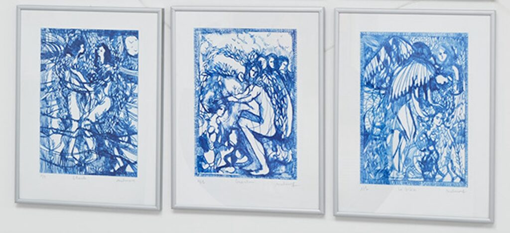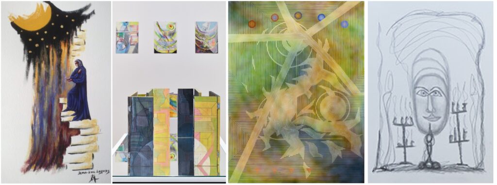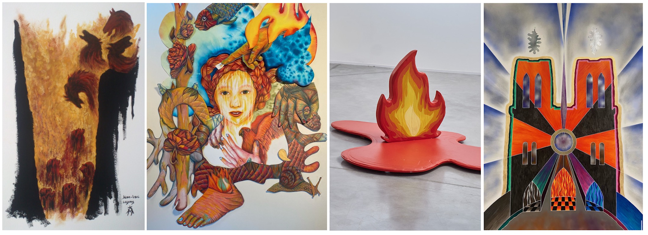 Une lumière qui est aussi un feu qu’elle a objectivé sous la forme d’une sculpture placée au centre de l’exposition. Tel un foyer rayonnant. Un feu que l’on retrouve dans la composition de dessins de Sandra Lorenzi, consacré à Notre-Dame de Paris et à son sidérant incendie. Un feu de l’apocalypse que l’on retrouve dans l’une des enluminures de Jean-Luc Leguay montrant une harde de chevaux basculant dans la fournaise qui dévore déjà des figures tourmentées de damnés. Tous ces feux et leurs flames nous renvoient aussi au feu sacré. Le feu sacré du divin, mais aussi celui de l’énergie du vivant, de l’émergence et de l’art. Un feu, que certains artistes se sont donnés pour mission d’entretenir et de transmettre. C’est aussi ce qui les rassemble dans l’exposition « Dess(t)ins visionnaires » qui se devait de célébrer et d’entretenir cette flamme.