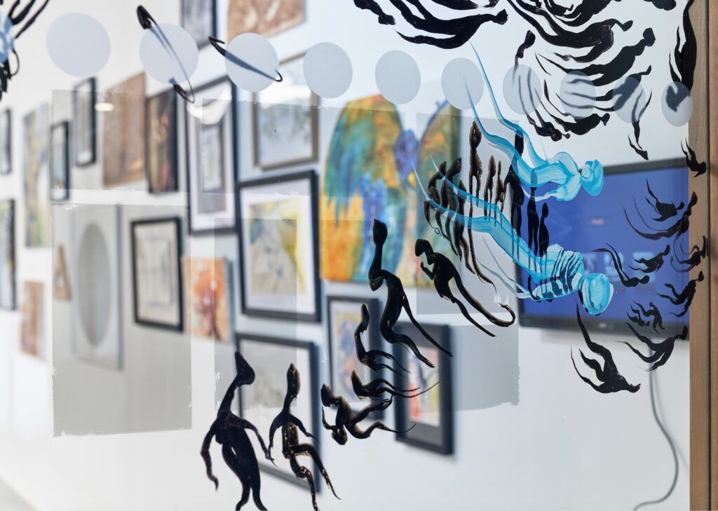 La connexion à l’arbre associée à l’art est une pratique écoesthétique que le Musée de l’Invisible expérimente depuis plusieurs années. Pour ce projet, elle a été associée à la tradition de l’arbre à loques, sur lequel on fixe des morceaux de vêtements ou autres objets. Notamment pour exaucer des vœux de guérison. Cette tradition est reprise ici avec des œuvres en guise de loques, accrochées sur un tracé au d’arbre réalisé directement au mur par Isabelle Perù. Cette œuvre collective reçoit des créations spécialement conçues par les artistes, mais aussi par le public qui a participé aux ateliers de dessin de connexion aux arbres.