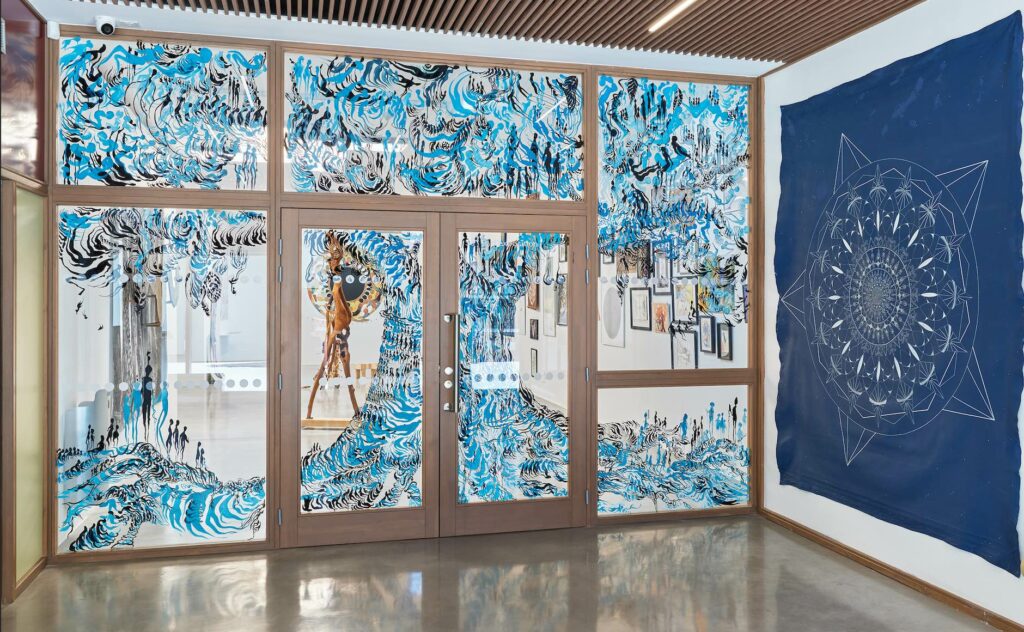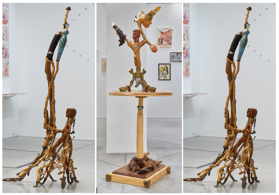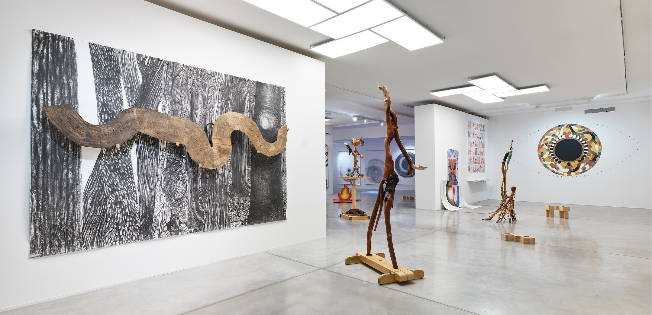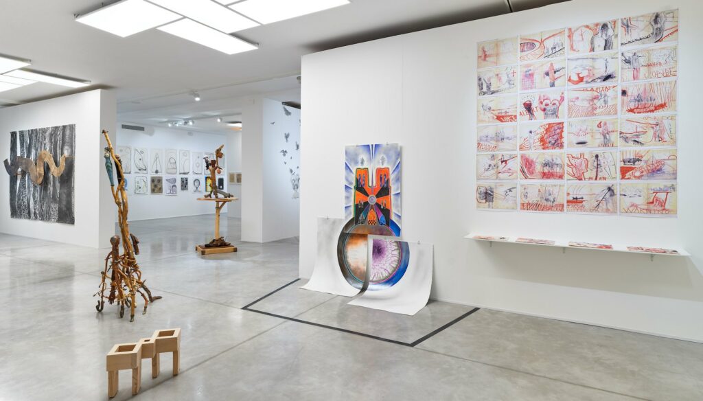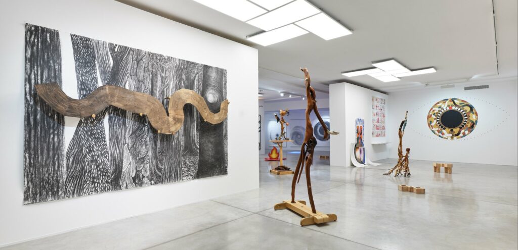 L’ensemble de cette proposition, qui est introduite par le tracé de l’arbre de vie sur la façade de verre de l’entrée par Charley Case, se prolonge dans l’espace d’exposition avec les contributions de Niek van de Steeg et de Rodolphe Hammadi, qui renvoient à la dimension votive des arbres et de l’art à travers le dessin et la sculpture. Elles sont complétées par plusieurs gestes artistiques réparateurs. Dont l’assemblage de dessins de Sandra Lorenzi, qui exprime la dimension ésotérique de Notre Dame de Paris et de l’incendie de la « forêt » de sa charpente de chêne, qui vient d’être restaurée. Ils font échos aux « dessins médecine » inédits que Jean-Luc Favero a dédié aux peuples natifs d’Amérique décimés lors de la colonisation de la conquête de l’ouest. Alors que l’artiste marocain Youssef el Yedidi accueille