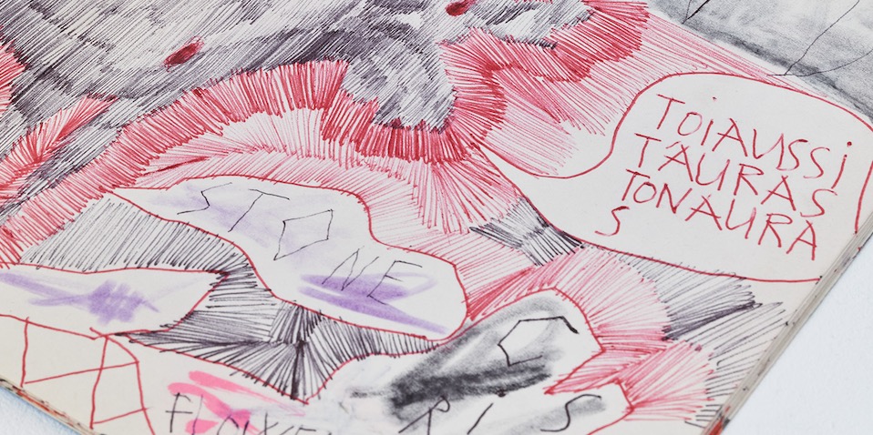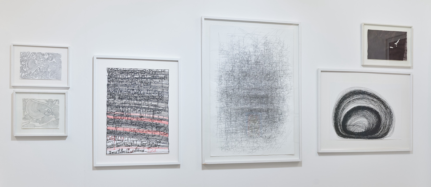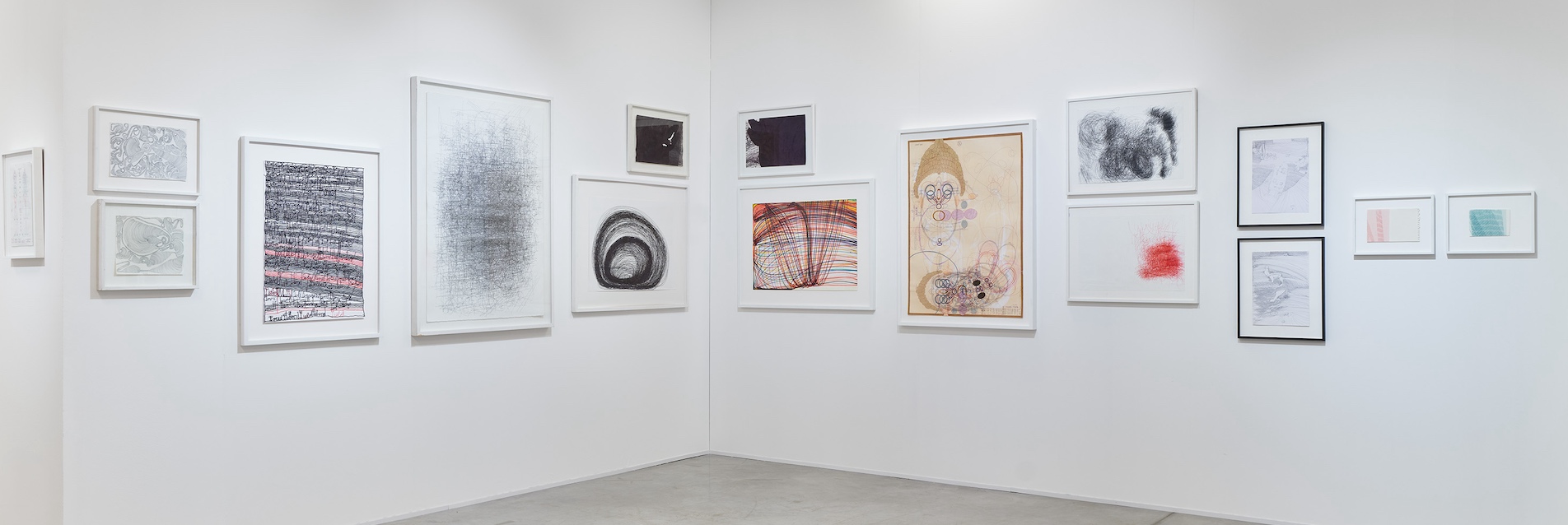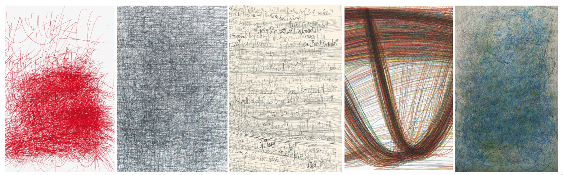 L’ensemble d’art brut, auquel participe Julius Bockelt, présente plusieurs artistes que l’on pourrait qualifier d’informels. Ils présentent une vibration visuelle différente à celle de Julius Bockelt, mais comparable et complémentaire. Informels dans le sens où leur univers graphique, qui n’est ni figuratif ni géométrique, présente des dessins de sortes de « gribouillis » informes. C’est le cas pour Dan Miller, Yuichi Saito, ou Momoko Nakagawa qui réalisent des œuvres d’un minimalisme et d’une subtilité déconcertantes, qui n’a pas d’égal dans l’art contemporain. Alors que Harald Stoffers sature ses surfaces de lignes hybrides composées de tracés de portées musicales et d’écriture automatique. Comme si lui aussi percevait quelque chose d’inaudible ou d’invisible au commun des mortels, dont il transcrirait la partition sous forme de dessin textuel. Cela concerne également l’artiste non brut Guillaume Barth, et le dessin inédit montrant une saturation aléatoire de la surface avec un stylo bille. Ce dessin qu’il a réalisé spécialement pour l’exposition a été conçu une nuit de pleine lune, moment réputé propice pour la mise en œuvre créative de flux énergétiques stellaires, que l’artiste a pu capter en usant de techniques visionnaires ancestrales liées à l’absorption de substances naturelles. A la fois très proche de l’art des médiums, des peuples premiers ou des artistes de l’altérité mentale.