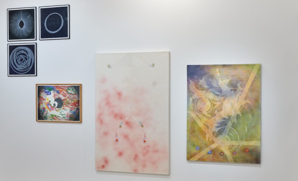En face, Arthur Lambert réinvesti lui aussi les géométries sacrées naturelles et culturelles, à travers un usage renouvelé des fréquences visuelles des couleurs et des nombres, tout en s’inscrivant dans la tradition du dessin initiatique alchimique consacré à l’accès et à la diffusion de la lumière sacrée. Ses trames aux effets visuels cinétiques et hypnotiques, font autant échos aux peintures aborigènes, qu’aux mesures mathématiques probabilistes et prémonitoires de l’artiste et acteur de cinéma Bernard Blancan.