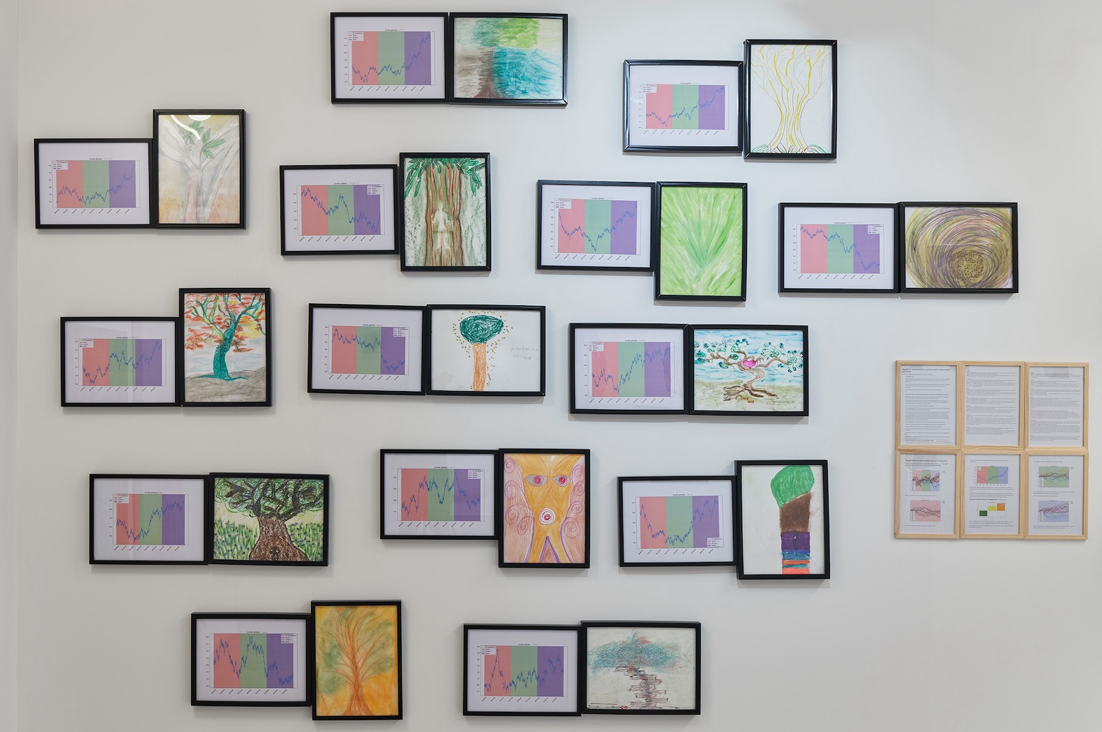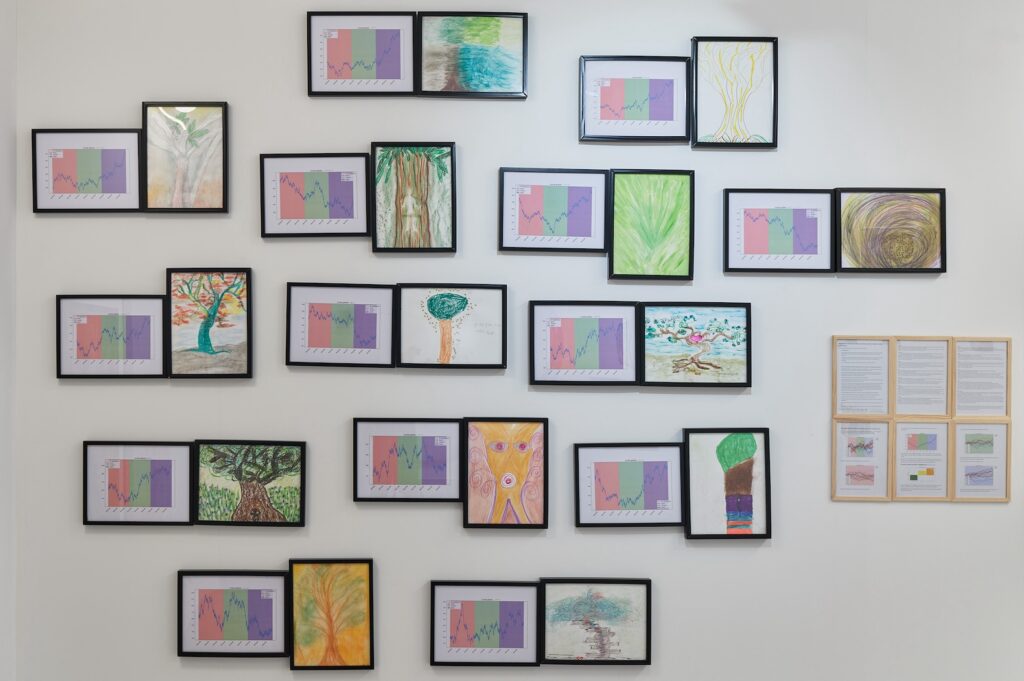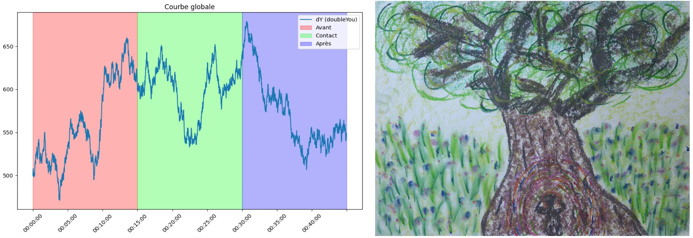 Ces mesures formant des dessins de courbes produites par des algorithmes générateurs de hasard associés à l’IA, sont associées à une série de dessins créés par un groupe d’art thérapie lors d’un atelier de connexion aux arbres. Réalisées à distance et à l’aveugle, avant et après l’atelier, ces mesures « psychophysiques » restituent étonnement l’implication psychologique et affective de chaque participant. Comme s’il existait une médiumnité visionnaire et divinatoire de la mathématique des nombres et du hasard, qui pourrait être corrélée, d’après Bernard Blancan, à la l’énergie de l’intentionnalité et des affects, qui sous-tendent aussi la création artistique. Une énergie Ce qui place cette proposition à la croisée de l’art, de la thérapie et des sciences alternatives.