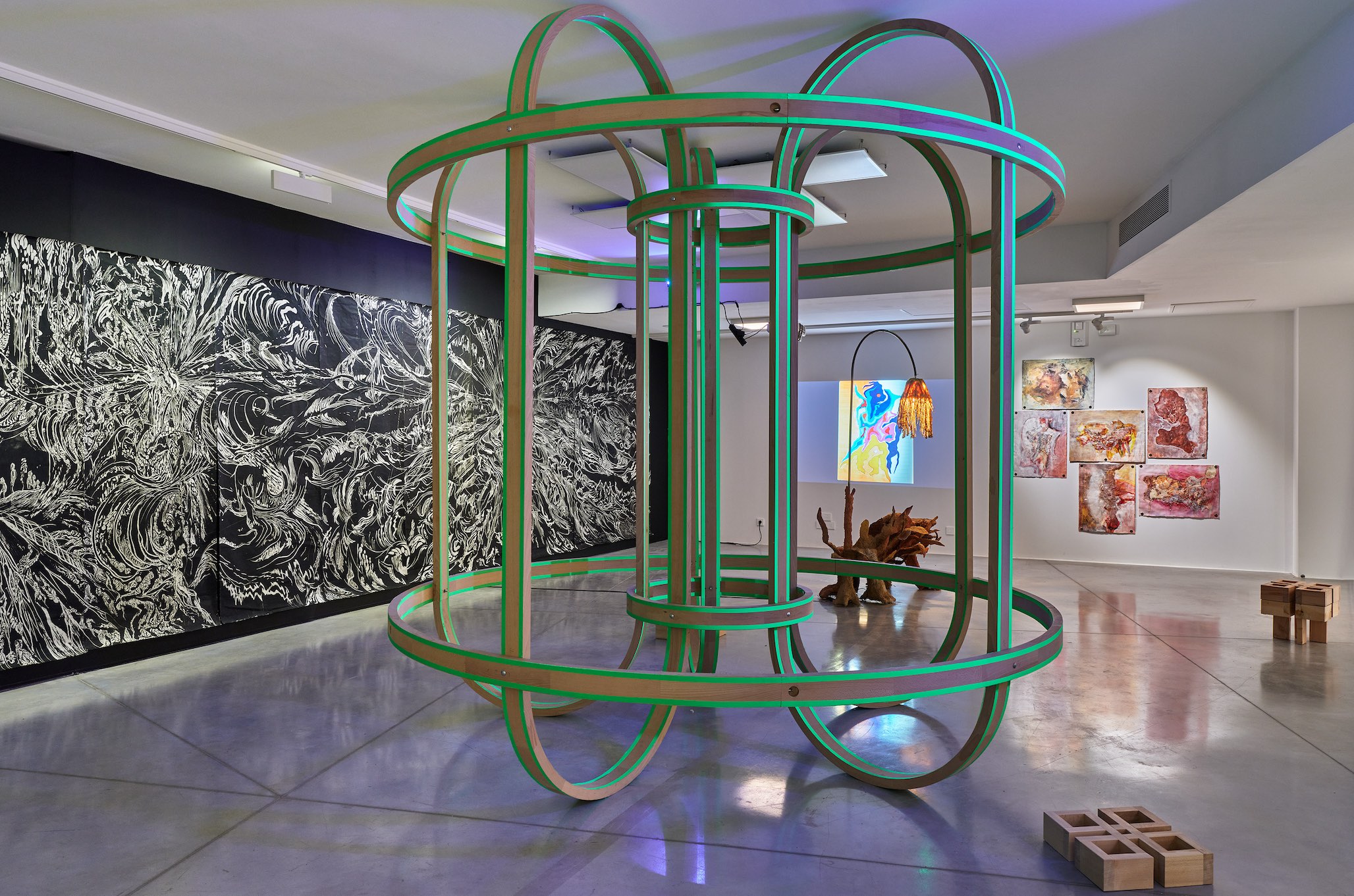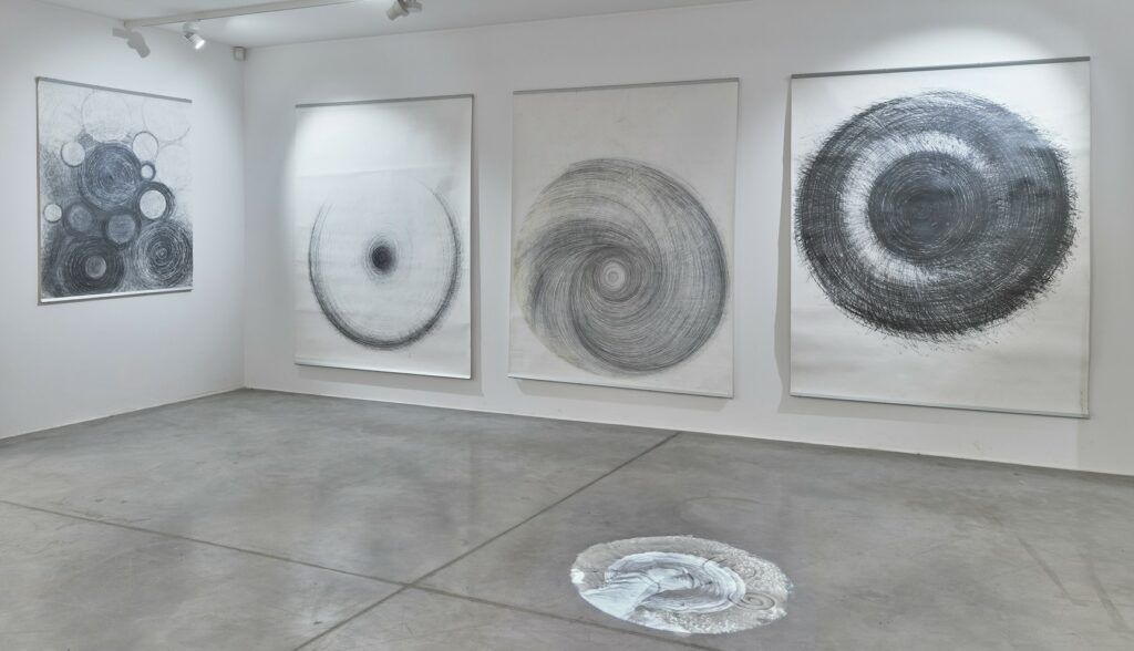 Une fois l’accrochage de l’exposition terminé, une première révélation a été l’apparition aussi évidente qu’inattendue, d’une récurrence de cercles, de ronds ou de sphères. Dont un certain nombre en forme de spire ou de vortex, qui font penser à des chakras, les centres énergétiques du corps humains, que l’on peut ressentir et activer. Comme si l’exposition elle-même, était un vaste organisme qui s’active par la présence et le regard du visiteur, qui en relie les œuvres dans sa déambulation. Ce parcours débute dès l’entrée avec Isabelle Perù et le dessin d’arbre sphérique de Charley Case, qui introduisent la première salle de l’arbre de soin.