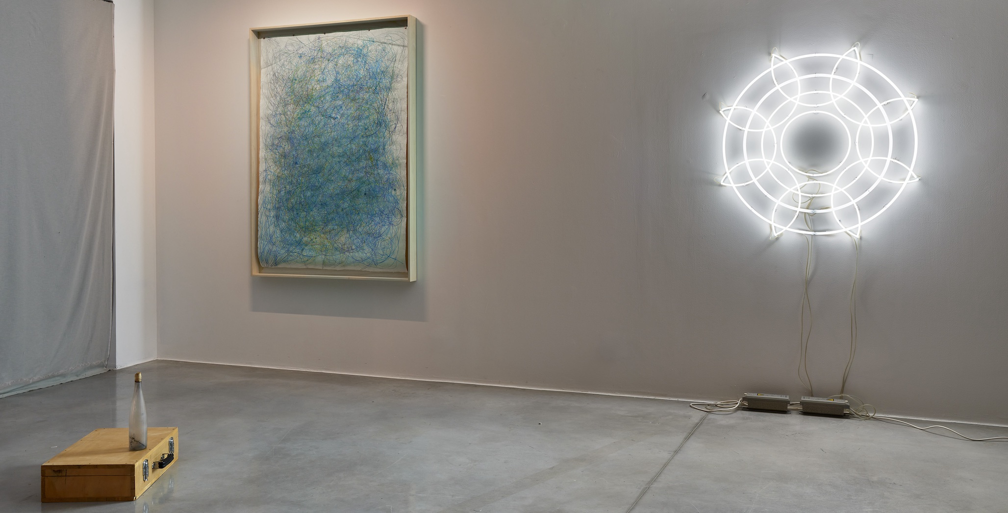 Ce parcours de spires inspirées, se poursuit et se termine dans deux aspirations visuelles, l’une dans le noir et le doré avec l’enluminure déjà évoquée de Jean-Luc Leguay, et un peu plus loin le cercle de lumière néon de Art Orienté Objet. Ces deux dernières œuvres opèrent comme de véritables trous noirs, (qui sont aussi des trous blancs et dorés), par lesquels l’exposition et ses visiteurs sont virtuellement aspirés vers un ailleurs invisible. Un ailleurs probablement géométrique et mathématique, comme celui que révèle Sandra Valabrègue, qui s’est livrée à une véritable exploration picturale dans le labyrinthe incommensurable des sphères de l’arbre sephirotique et des interconnexions qui les relient. Et qui pour d’aucun représentent les chakras invisibles de l’univers.