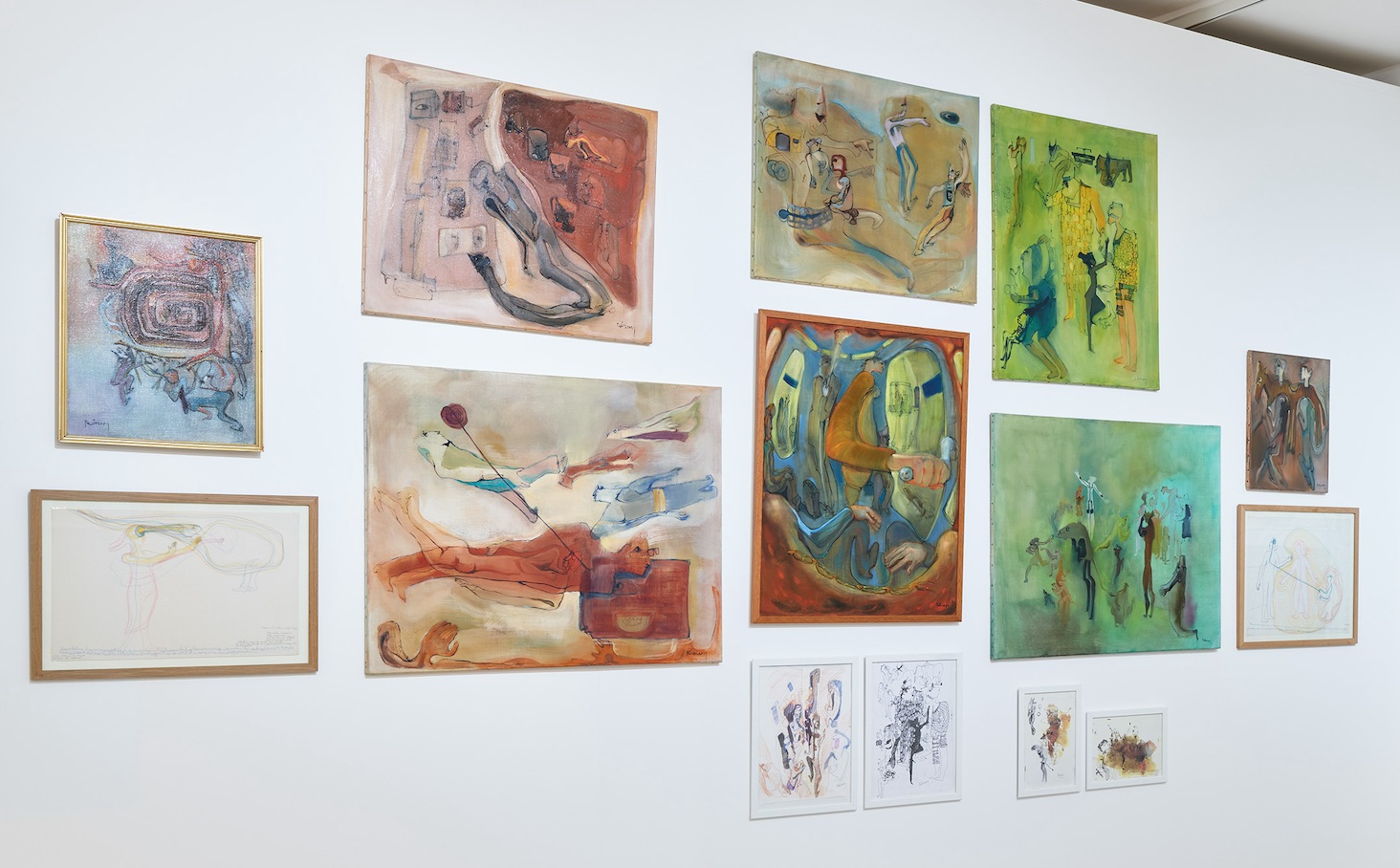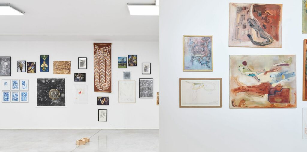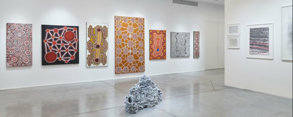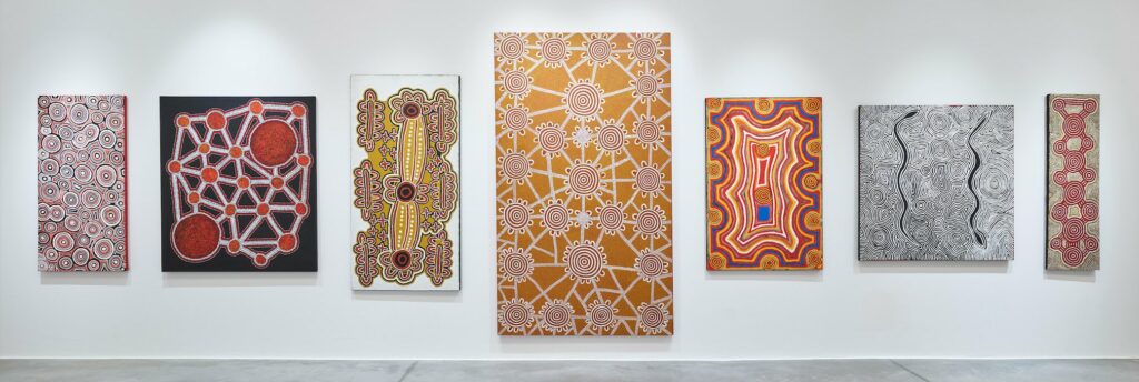 Parmi cette sélection, certaines font écho à un ensemble inédit dédié à l’art aborigène, avec des peintures plus ou moins récentes réalisées par Samantha Wilson Napurrurla, Tjumpo Tjapanangka, Leon Spencer Japaljarri, Peggy Rockham Napaljarri, Dave Ross Pwerle, Lilly Sandover Kngwarreye, Warlimpirrngna Tjapaltjarri, Theo Hudson Nangala, Sarrah White Napurrurla. Cet ensemble constitué avec la collaboration de la galerie Stéphane Jacob Arts d’Australie à Paris, rassemble une série de peintures au dessin géométrique arborescent symbolisant des pistes mémorielles reliées à des figures de la mythologie du « Dream Time » aborigène ». Ces peintures ont aussi en commun de renvoyer à la structure doublement symétrique et arborescente de l’arbre sephirotique des kabbales juives et chrétiennes, auxquelles elles font échos dans différents endroits de l’exposition.