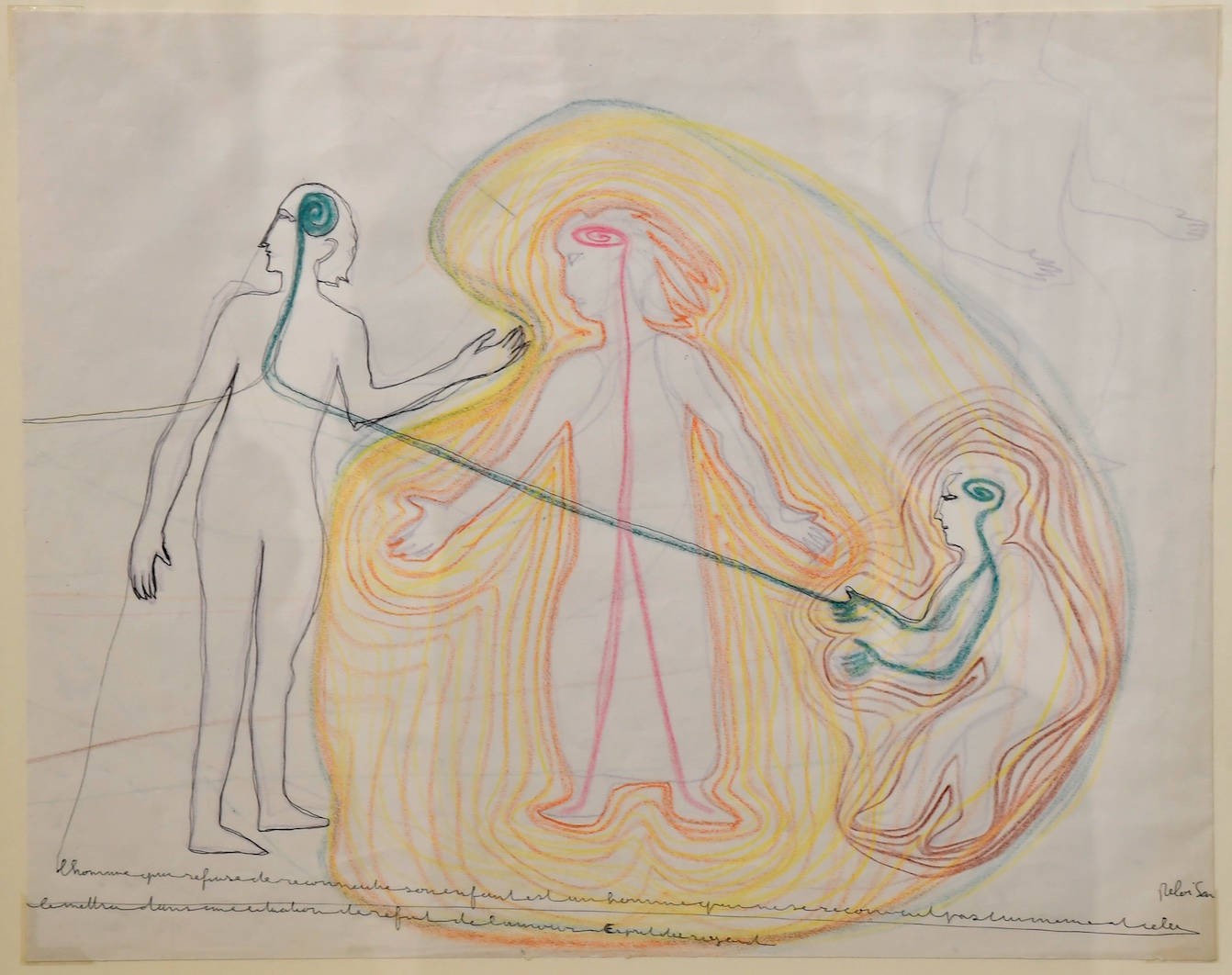 D’aucuns évoquent une conscience délocalisée à laquelle l’art donnerait accès, Ce qui fait aussi l’objet de nouvelles approches scientifiques, par exemple sur les incidences de l’esprit sur la matière, également abordées dans l’exposition. L’art visionnaire est aussi associé à des problématiques de santé mentale que la pratique artistique permettrait de réguler. Notamment par le dessin.