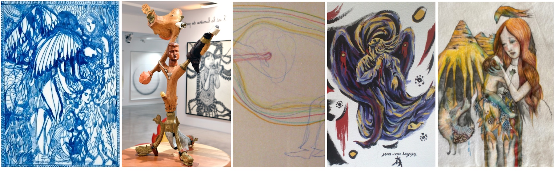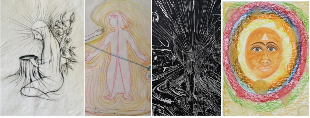 Ce mouvement d’émancipation est toujours très présent et actif dans l’art actuel, sans que l’on ait pris la mesure des réalités qu’il recouvre. Il est d’ailleurs très présent dans « dess(t)ins visionnaire », dont il est l’un des axes. Si bien que l’exposition est habitée par certaines figures de la spiritualité et de la sacralité. Comme on l’a vu avec la Vierge à l’arbre de Anne Laroche. Cela concerne directement et profondément certains artistes d’art médiumnique et d’art brut, comme Philippe Deloison, Stéphane Besnard ou Augusto Giraldo. De même qu’Aurélie Dubois avec son grand dessin intitulé « Métanoïa » qui relate un épisode de révélation mystique qu’elle a elle-même vécu, à travers une déflagration de lumière.