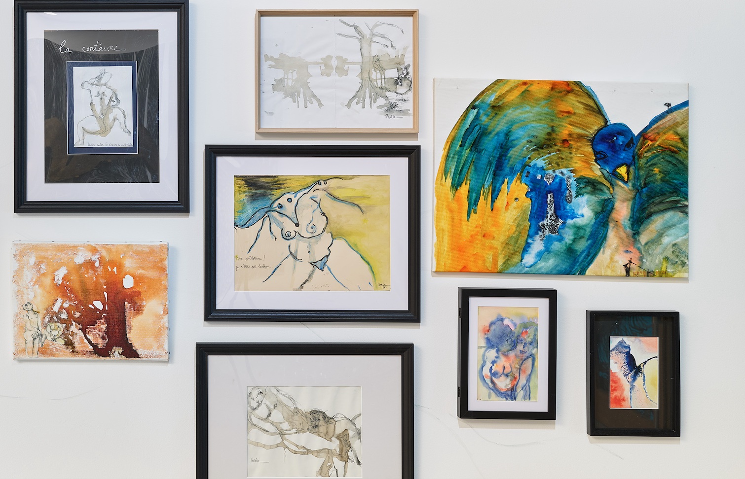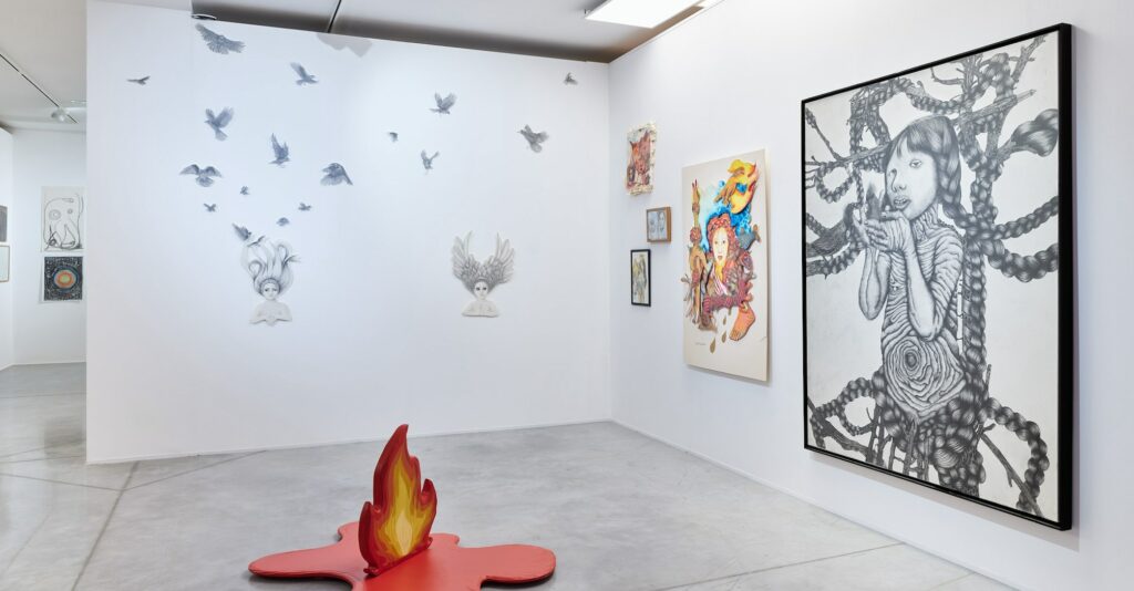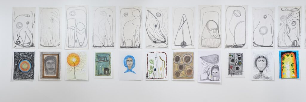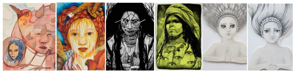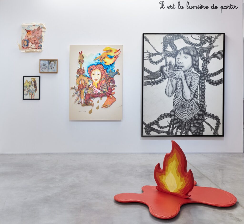 Le dernier carré de cet espace, dit « des sorcières », rassemble trois artistes femmes pratiquant un dessin figuratif a dimension ésotérique et spirituelle directement issu de leurs pratiques visionnaires. Isabelle Perù a eu la vision d’une enfant dont les volutes de la chevelure donnent naissance à des oiseaux. Elle fait écho à Aurélie Dubois dont l’imagerie est liée à un vécu de métanoïa, c’est-à-dire de révélation divine qui a fortement impacté sa pratique du dessin et son implication artistique. Leurs œuvres qui ne sont pas sans rapports visuels et formels, font écho aux puissants dessins de portraits de Myriam Mechita, qui revisitent les motifs apotropaïques tracés au henné ou tatoués sur les visages de figures familiales, issues comme elle d’ascendances culturelles berbères et Kabyles.