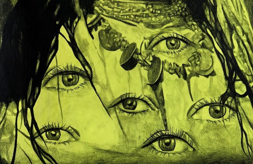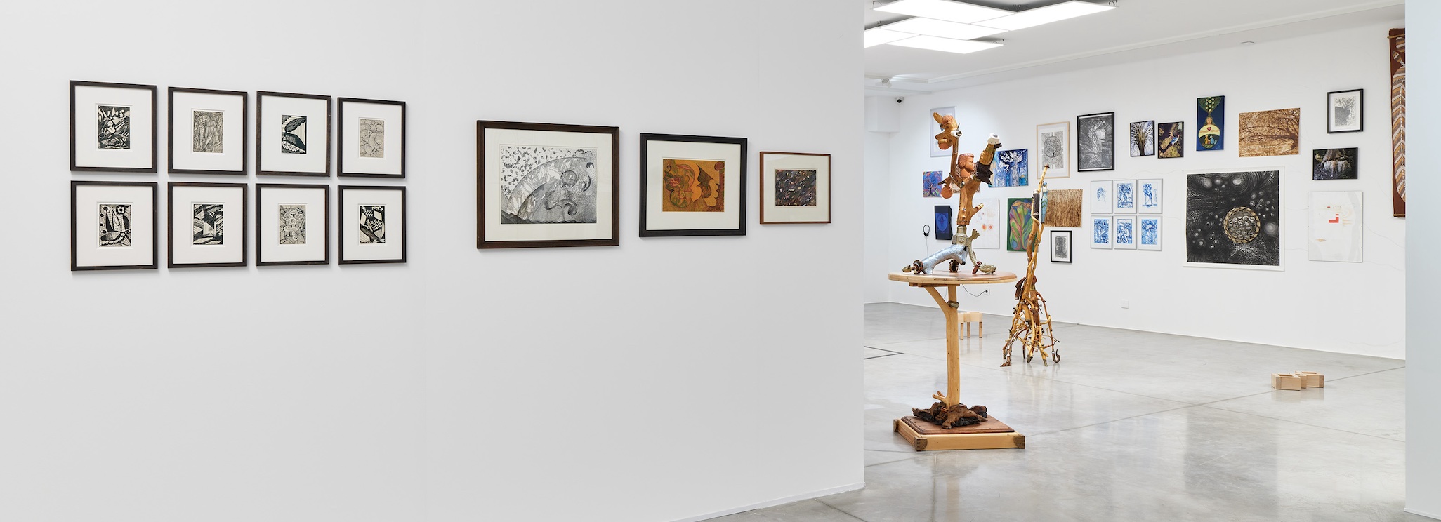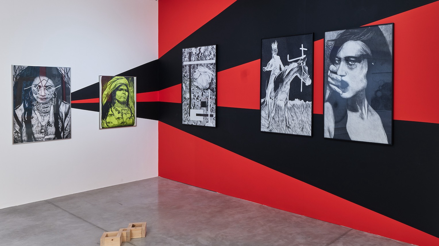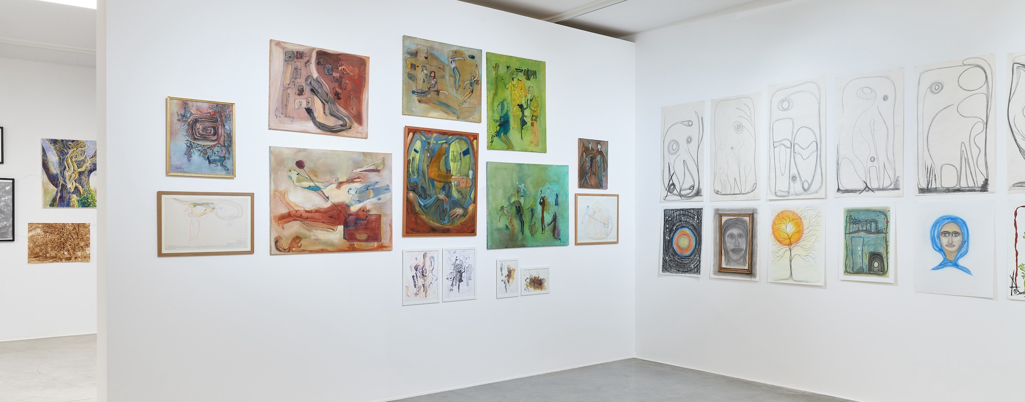 Le dernier carré de cet espace, dit « des sorcières », rassemble trois artistes femmes pratiquant un dessin figuratif a dimension ésotérique et spirituelle directement issu de leurs pratiques visionnaires. Isabelle Perù a eu la vision d’une enfant dont les volutes de la chevelure donnent naissance à des oiseaux. Elle fait écho à Aurélie Dubois dont l’imagerie est liée à un vécu de métanoïa, c’est-à-dire de révélation divine qui a fortement impacté sa pratique du dessin et son implication artistique. Leurs œuvres qui ne sont pas sans rapports visuels et formels, font écho aux puissants dessins de portraits de Myriam Mechita, qui revisitent les motifs apotropaïques tracés au henné ou tatoués sur les visages de figures familiales, issues comme elle d’ascendances culturelles berbères et Kabyles.
