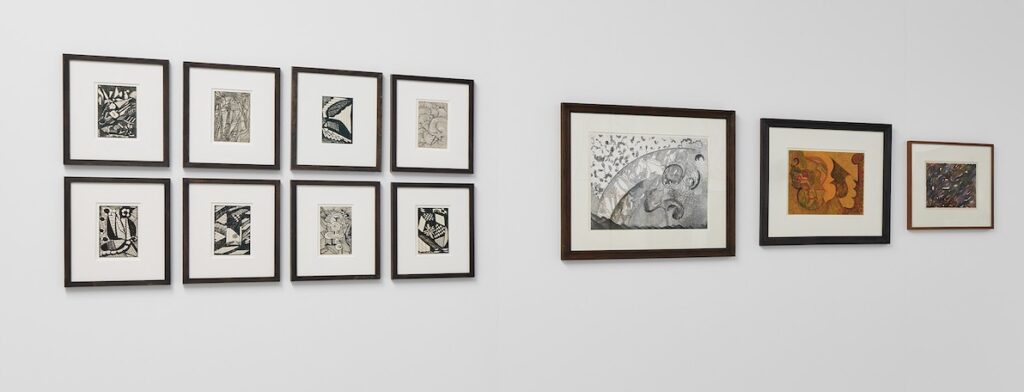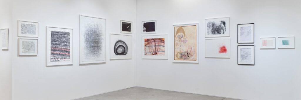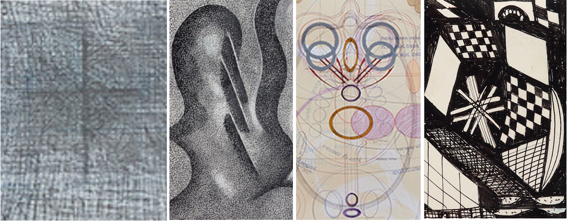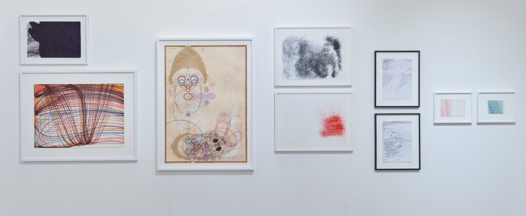 Ils sont mis en regard d’une sélection d’œuvres d’art brut abstrait, qui ont pu être réunies grâce à la collaboration de la galerie Christian Bert Art Brut, savec des œuvres de Momoko Nakagawa, Beverly Baker, Harald Stoffers, Lubos Plny, Yuichi Saito, Xie Hong, Zdenek Kocek, Dan Miller, Julius Bockelt, Farnood Esbati, ou Carlos Augusto Giraldo. Et dont certaines sont liées à des formes d’altérité mentale comme l’autisme ou la schizophrénie.