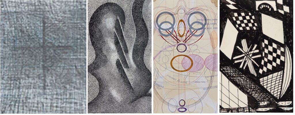 L’exposition a aussi été l’occasion d’une autre exploration, cette fois préméditée, consacrées aux motifs et aux déploiements de volutes dans la peinture ou le dessin visionnaire médiumnique. Lors d’une exposition précédente du Musée de l’Invisible (Fréquences brutes, à la galerie Christian Berst à Paris en 2023), j’avais remarqué un point commun entre plusieurs œuvres d’art médiumnique de différentes périodes, avec Fernand Desmoulin au début du 20è siècle, Henriette Zéphyr dans les années 1970/80, et Philippe Deloison actuellement.