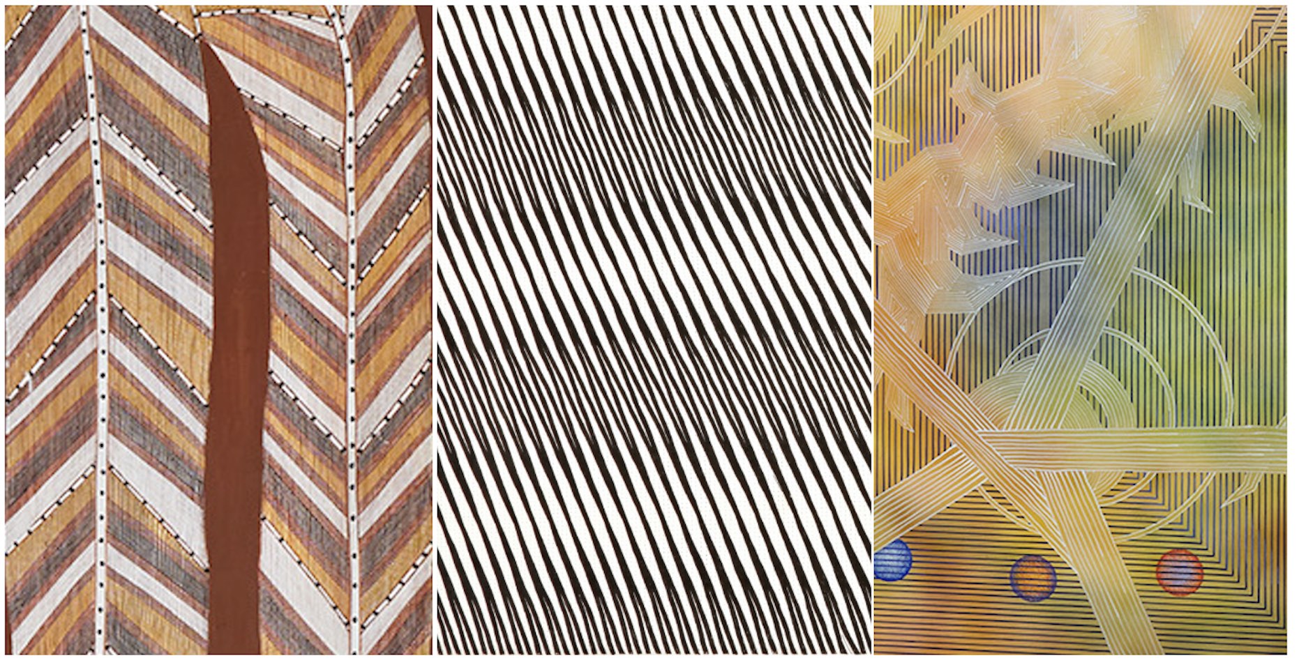 Tout en produisant un effet d’optique digne de l’art cinétique, tout à fait comparable à celui de certaines peintures Aborigènes. On retrouve ce phénomène d’utilisation d’une fréquence visuelle dans la peinture d’Arthur Lambert, ou de réseaux de lignes droites dorées formant des trames qui s’articulent sur le plan pictural. Elles constituer le substrat visuel et spirituel, d’une peinture dédiée à la méditation et à la contemplation de la lumière, qui revisite aussi l’art des géométrie sacrées.