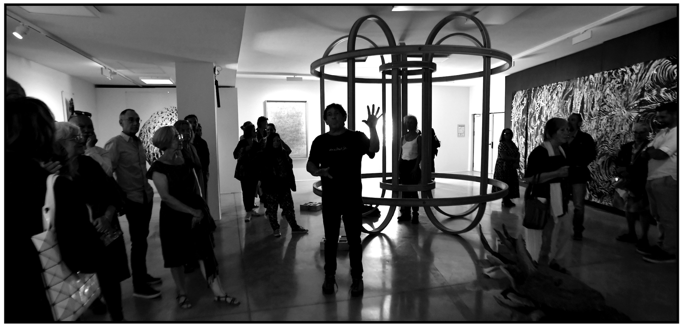 Ce nœud énergétique de l’exposition « Dess(t)ins visionnaires », introduit à la dernière salle du parcours occupée en son centre par la sculpture toroïdale de Olivier Raud, au cœur de laquelle on peut se placer pour capter et laisser agir les forces en présence. Plusieurs visiteurs ont clairement capté et ressenti l’effet de cette géométrie et du bois polarisé sur le corps humain. Un corps qui va lui-même se mouvoir comme automatiquement, indépendemment de la volonté ou de la conscience, avec un minimum de lâcher-prise.