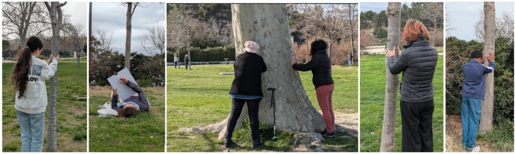 Une autre série d’atelier des visions a été mise en place dans une perspective écoesthétique à partir de la pratique du contact à l’arbre, ou du bain de forêt, et d’un protocole élaboré sur plusieurs années en collaboration avec les Ecoles d’art nationales ou territoriales.