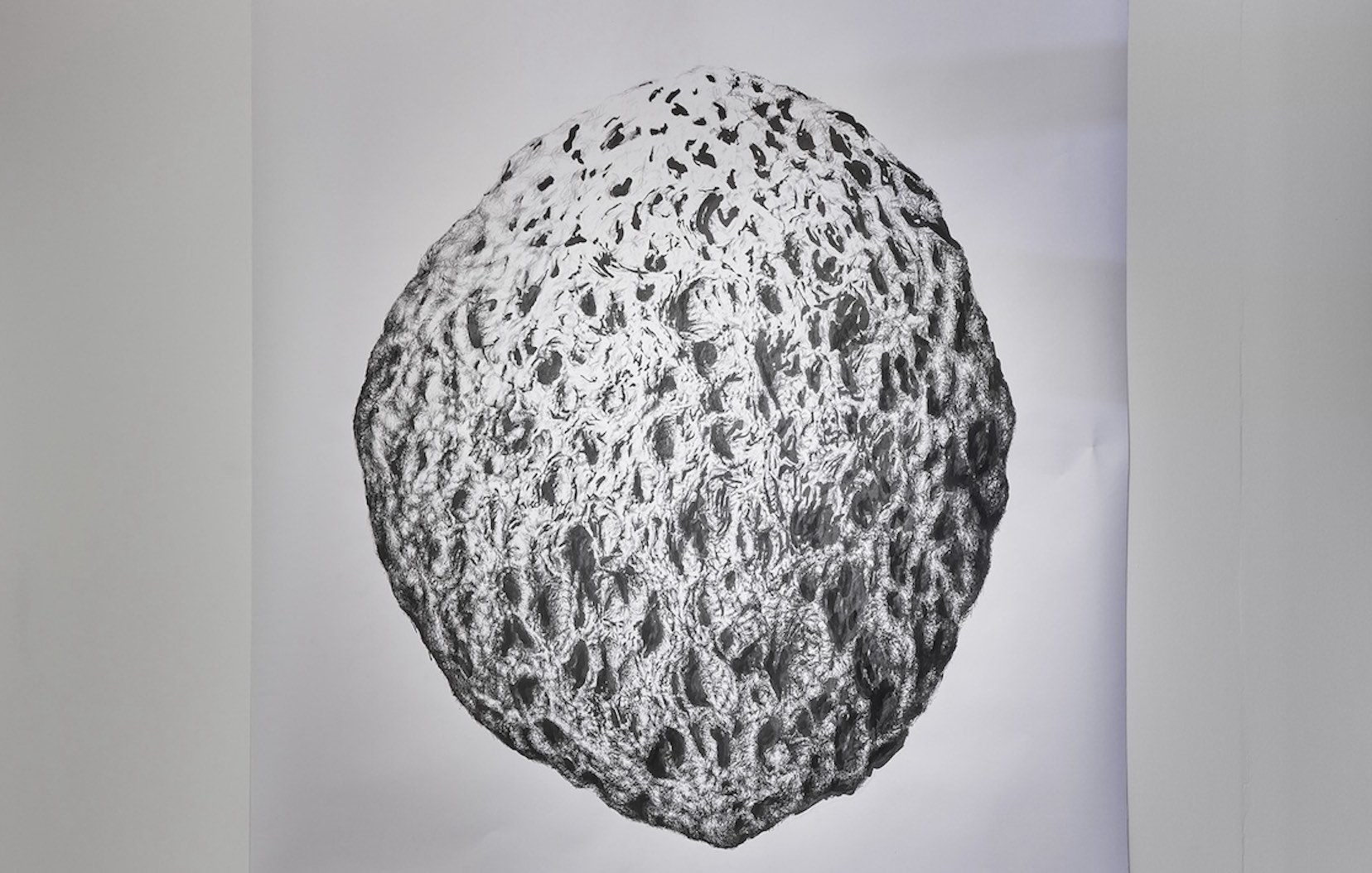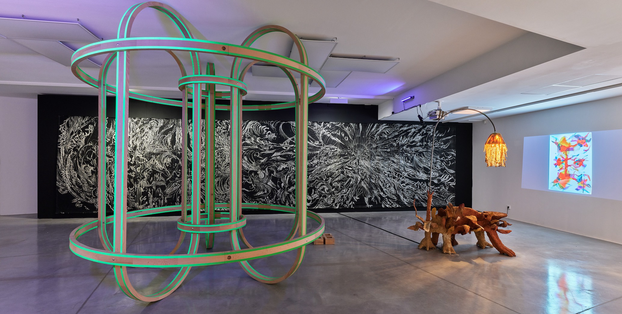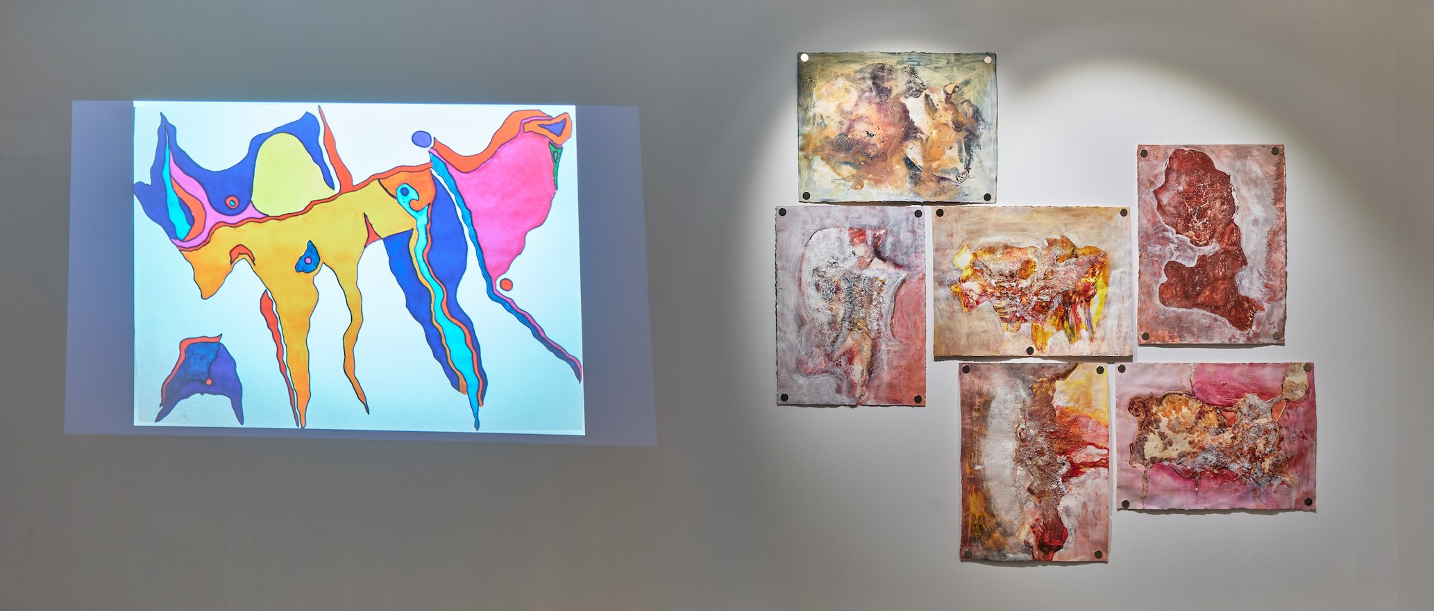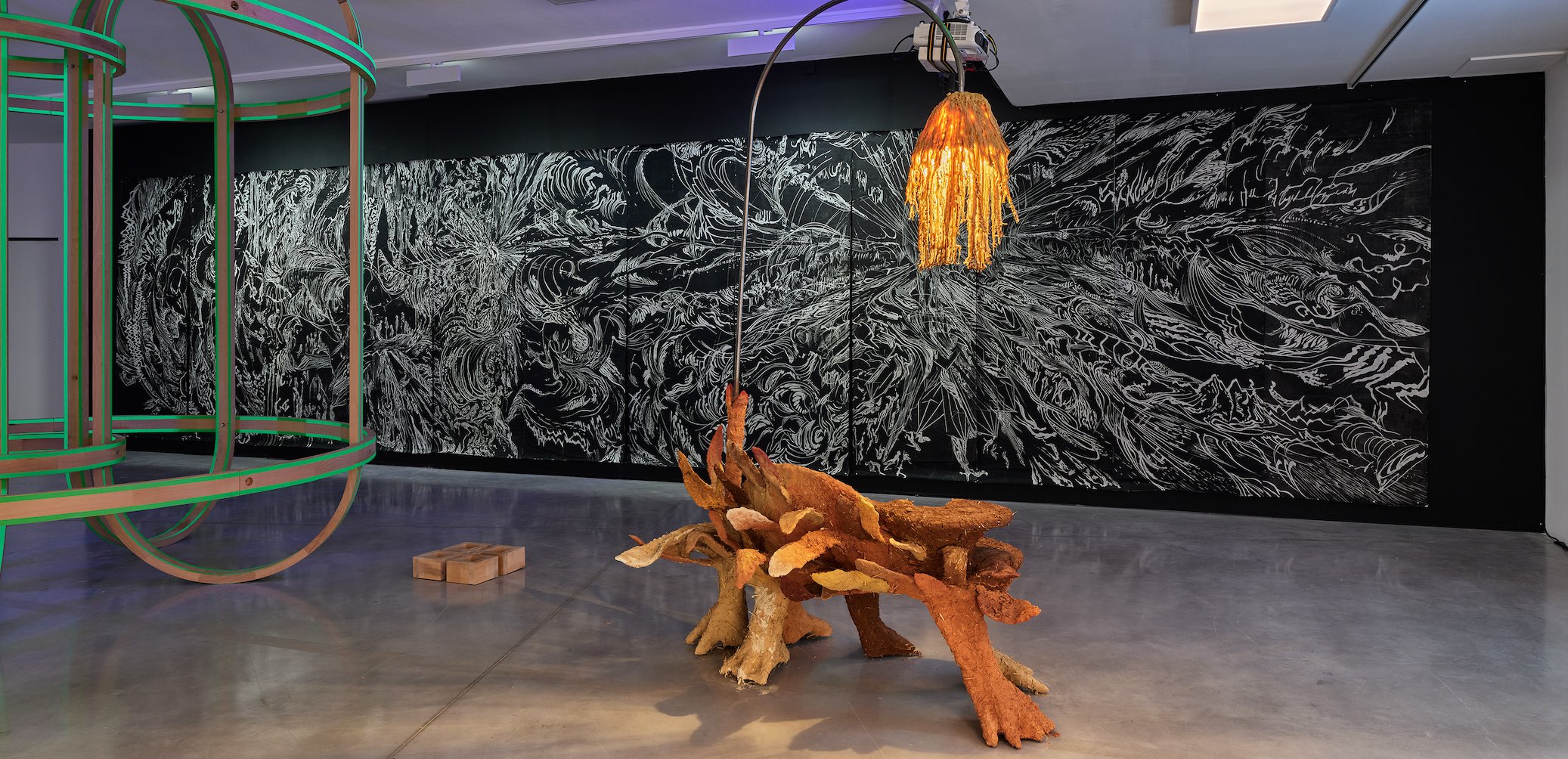Depuis cette position centrale, le visiteur peut alors contempler les différents panneaux de la néo-grotte qui offrent autant d’ouvertures sur d’autres dimensions. La grande fresque réalisée à la disqueuse par Charley Case rend hommage à la Vénus de la grotte Chauvet, ainsi qu’aux esprits et aux énergies qui l’originent. Cette Vénus à dimension cosmique fait face à d’autres entités plus abstraites elles aussi de grandes dimensions. Comme la grande pierre en lévitation en forme de planétoïde d’Anaïs Lelièvre, qui renvoie à l’une de ses céramiques au dessin organique que l’on a pu voir dans l’espace d’art brut. Une autre sculpture en terre et béton de Tiphaine Calmettes, aux formes de banquette pétrifiée, renvoie aux créatures hybrides issues des mondes souterrains. Elle permet de faire corps avec la matière même et la symbolique profonde de la terre. Cette œuvre fait face à une projection vidéo de dessins automatiques et numériques réalisés par Anika Mi sur plusieurs années. Ils sont associés à une série de dessins automatiques réalisés à la colle chaude où l’artiste a fait émerger des univers et des figures hybrides issues conjointement de l’inconscient et des outre-mondes.