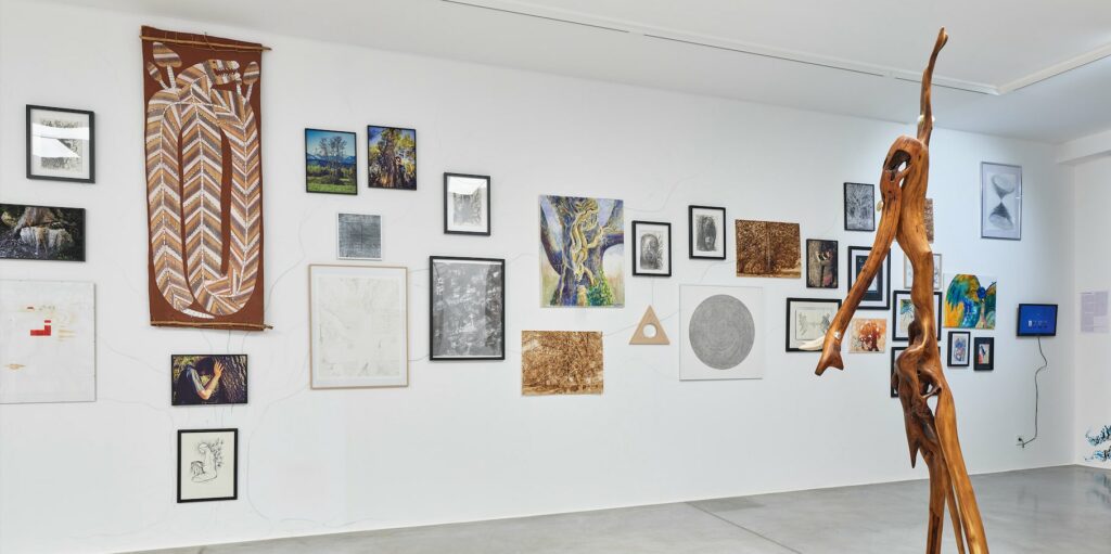 Car la magie des arbres peut aussi opérer en intérieur, sans leur présence directe et au sein même de l’exposition. Notamment à travers la charge des images, des dessins où des peintures qui restituent leur énergétique. Cet étonnant phénomène est bien perceptible avec les œuvres de Isabelle Dubset et sa peinture d’un chêne aux accords chromatiques rayonnants. De même que les dessins en forme de vortex de Daniele Orcier ou de Alain-Jacques Lévrier-Mussat, qui incarnent la dynamique ascensionnelle des arbres à travers la suite mathématique de Fibonacci, que l’on retrouve aussi bien à l’œuvre dans la pousse des végétaux que dans celle des spires galactiques. Cette dimension de l’arbre qui relie la terre et le ciel, se retrouve dans la symbolique du serpent arc-en-ciel du peintre Aborigène Paul Nabulo Namarinjmak qui a été placée au faîte et au centre de l’arbre.