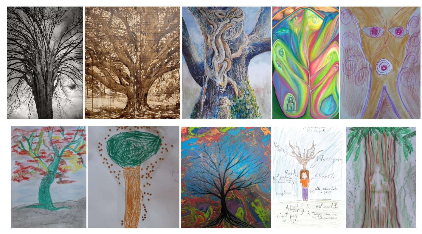 L’un des vœux de soin adressé à cet arbre concerne notre culture des arbres et de la forêt qu’il est urgent de restaurer et de réinventer. Encore faut-il pour cela replanter l’arbre qui est en nous. C’est ce que nous aide à réaliser Jean-Luc Favero avec ses lavis au brou de noix, d’arbres dessinés sur le motif, et que l’on sent littéralement encore frémir à la surface du papier. De même qu’Etienne Renzo avec ses photographies du pattern naturel des branches des arbres, associés à des vues de connexions à l’arbre. Comme ont pu le pratiquer, lors d’un atelier à l’Ecole Supérieure d’Art d’Aix-en-Provence, Elisa Fouquet avec une série de visions de portraits inconnus, ou Clivia Ripöll avec ses dessins de configurations architectoniques visionnaires. D’autres ateliers réalisés à Paris avec l’Institut métapsychique international, ou à Istres avec le centre d’art Polaris, sont restitués sous forme de diaporama.