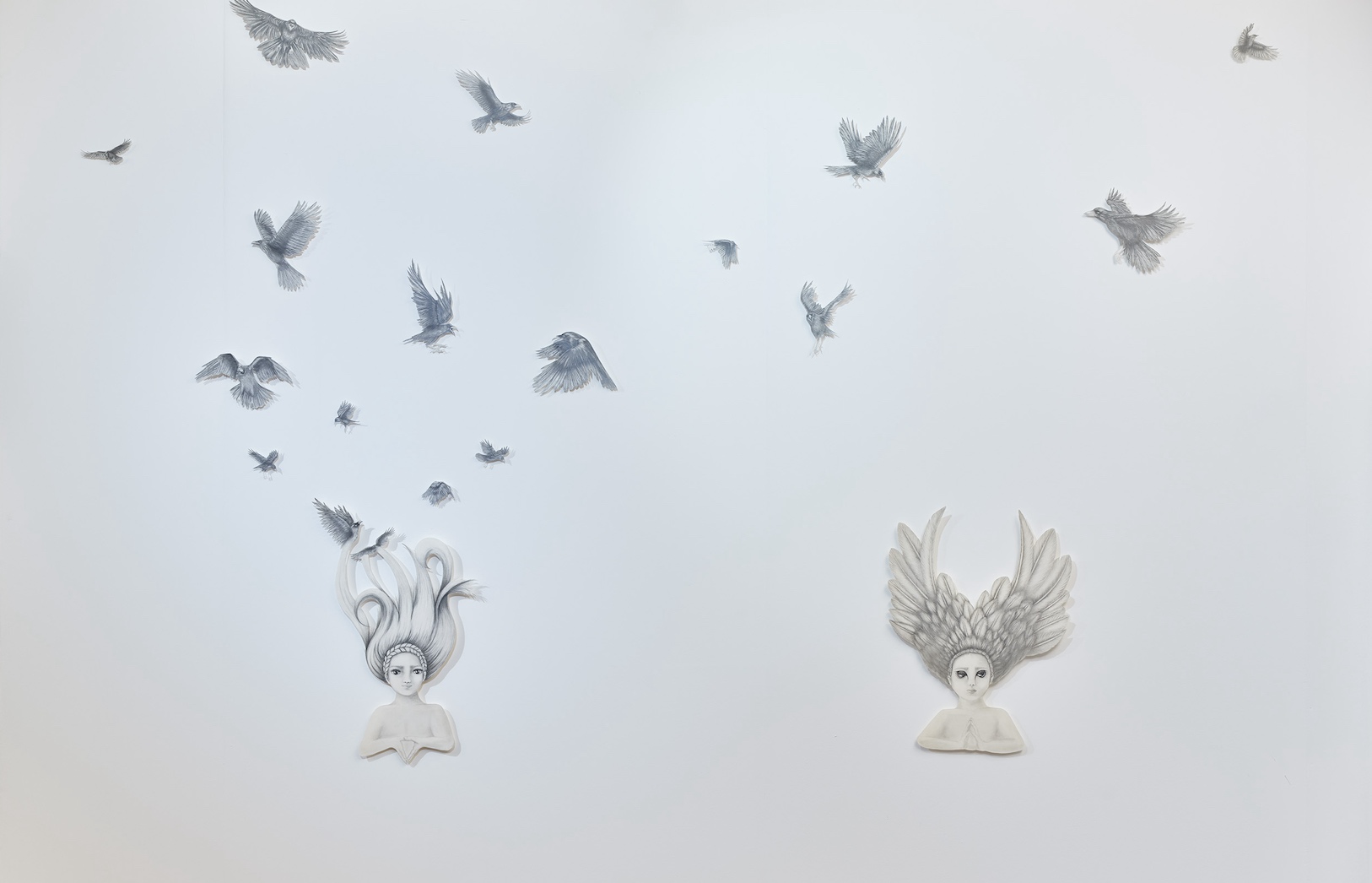 Ces visages clairement issus de captations médiumniques forment une galerie de portraits assez mystérieuse et troublante. Ils sont relayés par un second groupe qui se concentre dans l’espace occupé par Aurélie Dubois, Isabelle Perù et Myriam Méchita, dans une mise en espace qui a occasionné d’étonnantes synchronicités visuelles. Comme celle entre Isabelle Pérù et Aurélie Dubois où il est question de chevelures et d’oiseaux associés. Cette étrange concordance n’ayant été remarquées qu’une fois les œuvres accrochées. Comme si les visages, et les oiseaux en présence délivraient un message ou un chant qui reste à décrypter et à entendre. Ceci face aux impressionnants dessins de Myriam Mechita qui renvoient directement aux pratiques de visions qui ont encore lieu dans certaines cultures d’Afrique du nord. Notamment à travers les motifs tracés au sur les fronts au niveau du troisième œil. A la fois organe et instance visionnaire s’il en est.