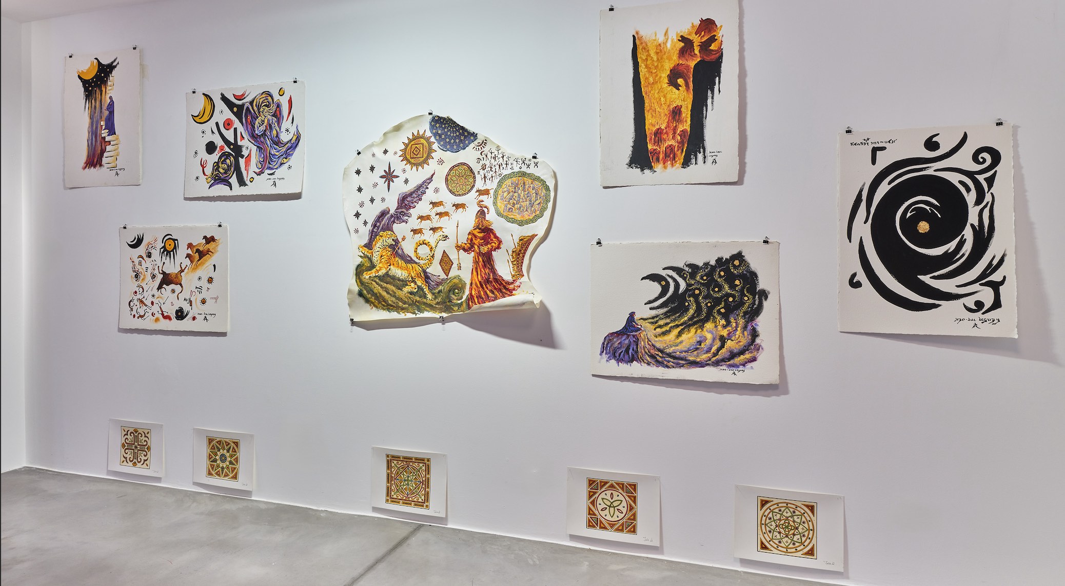 Cette culture du dessin à dimension de cosmogramme se prolonge dans la série d’enluminures sur parchemins de Jean-Luc Leguay et Julie Lô, qui nous immerge dans les arcanes symboliques des géométries sacrées du moyen-âge. Et de leur alchimie des couleurs. Cette constellation de motifs et de symboles, incarne une dimension initiatique où il est question d’arbre aux douze soleils, d’escalier mystique, d’ange blessé, de rien originel et de création, mais aussi de chute et d’affrontement, de chevaux de l’apocalypse, de ravage de la guerre, de chasse au tigre. Comme autant de symboles de forces à exorciser ou à apprivoiser pour mieux les transmuter. Probablement aussi pour restaurer le lien transhistorique qui relie les artistes visionnaires des premiers âges à ceux de notre ère contemporaine. Notamment à travers une dernière vision spécialement dessinée pour l’exposition : celle d’une spire galactique en forme d’embryon naissant d’un magma d’or, intitulée … Dess(t)in visionnaire.