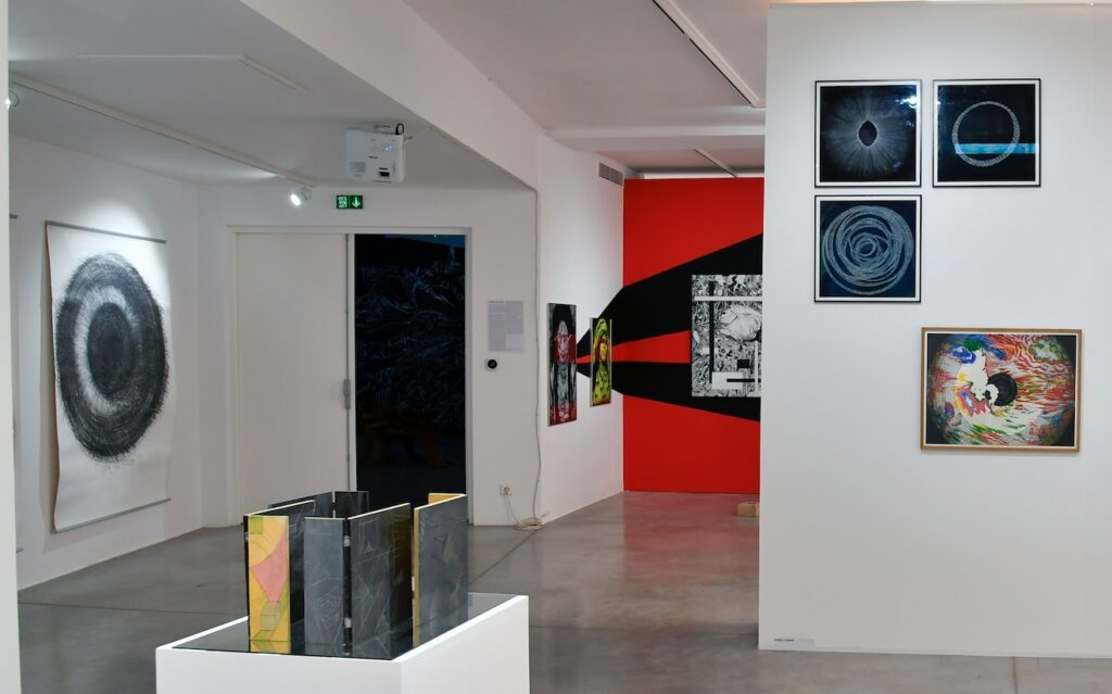 le visiteur avec un dessin mural monumental d’œil apotropaïque (qui conjure le mauvais sort), bien connu à travers les motifs d’amulettes ou de talismans du bassin méditerranéen, dont celui du troisième œil, qui accompagne et protège ici le visiteur dès arrivée dans l’exposition pour en suivre les méandres du parcours.