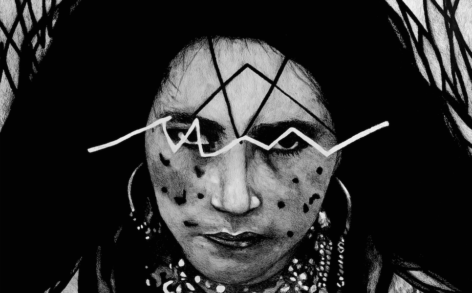 Le motif formant un losange est aussi un symbole qui s’est imposé à Myriam Mechita lors de la réalisation de ses dessins. En particulier dans le portrait de femme berbère qui arbore un tracé de motifs de chevrons entrecroisée sur le front, à l’emplacement du troisième œil. L’artiste a bien voulu préciser les conditions et les contours de cette apparition : “ce signe est apparu comme un hommage aux tatouages berbères que portaient ma grand-mère et mes tantes. Avec des arabesques et des formes géométriques sur le front. Souvent, celà parle d’une appartenance à un territoire, à une tribu. Pour moi, le signe noir parle du ciel et de la terre qui s’unissent. Je l’ai dessiné parce qu’il m’est apparu comme ça. La jonction entre le ciel et la terre crée un losange qui fait écho aussi à la forme, ou à un symbole féminin. Sorte de dessin primordial de ce qui caractérise une forme qui ouvre, telle une nouvelle porte. Quant à la ligne blanche sur les yeux, elle était pour moi l’expression de l’énergie qui traverse les regards. Les deux signes noir et blanc se touchent. L’un est engendré par l’autre et j’aimais l’idée que son visage et ses yeux engendrent de la force, une force électrique, énergétique. En réalité, quand je dessine, je vois les choses qui apparaissent au fur et à mesure. Ici je voyais la femme, je voyais les cheveux qui s’électrisaient. Je voulais que ce dessin parle de ça. “