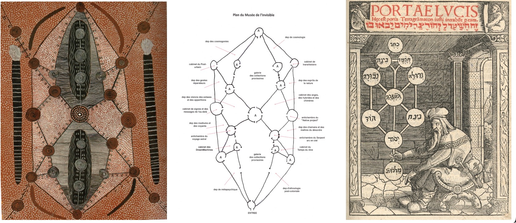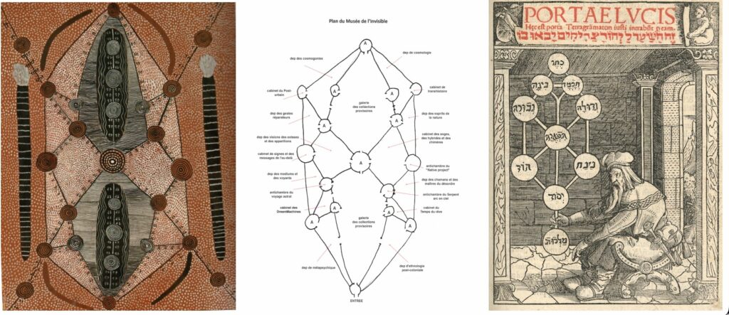 Il faut dire, et peut-être même avouer, que la géométrie de la structure de l’arbre sephirotique, a servi de guide à la mise en œuvre de l’exposition, dès les prémices de sa conception. Cette structure est d’ailleurs intimement liée à l’histoire même de l’émergence du Musée de l’Invisible qu’elle accompagne dès ses débuts. Notamment à travers son épisode fondateur, au moment de la mise en place du projet artistique et structurel du Musée de l’Invisible, à travers diagramme qui s’est avéré être un véritable cosmogramme. Ce plan inspiré d’une peinture Aborigène rencontrée au Musée du Quai Branly à Paris en 2014, a généré un dessin qui s’est avéré très ressemblant, et quasi superposable, au dessin caractéristique de l’arbre de la kabbale, avec ses neuf cercles dénommés sephirots, reliés par des tracés ou des chemins descendants et ascendants. Et ceci, sans que le dessin ni le programme de l’arbre des sephirots ne soit connu dans ces détails à ce moment-là.
