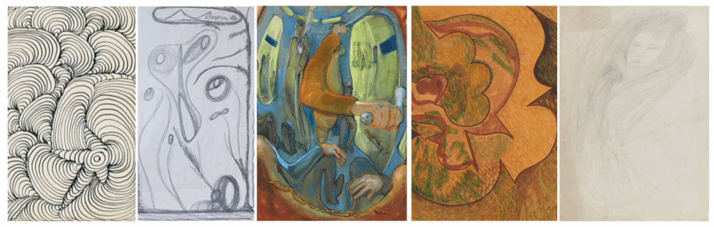 Chacun de ces artistes ayant une manière différente mais comparable de faire émerger des visages ou autres motifs, de réseaux d’entrelacs de traits fin et sérés formant des volutes et des arabesques. Ayant questionné Philippe Deloison sur sa compréhension de cette caractéristique, il me répondit que ses propres visions étaient souvent issues à ces volutes dessinées ou peintes. Le concernant elles correspondent à des perceptions visuelles qu’il a dans différents contextes, que ce soit à l’intérieur ou à l’extérieur. En particulier avec certaines personnes dont il perçoit les auras, qui ressemblent à des circonvolutions colorées de fumée de cigarette qui peuvent entourer les corps. Comme si ces volutes étaient les auras de l’univers desquelles émergent et émanent les visions.