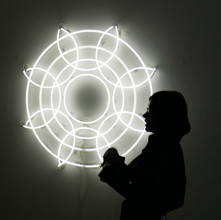 Au centre du panneau le dessin de néon réalisé spécialement pour « Dess(t)ins visionnaire » par Art Orienté Objet, (le duo formé par Marion Laval-Jeantet et Benoit Mangin), réveille la culture et les pouvoirs du dessin cosmogramme à vocation d’entretien ou de soin astrologique. « Le cristallogramme des mutations », est inspiré de divers tracés ésotériques vraisemblablement issus d’observations astronomiques. Il propose au visiteur de s’aligner corporellement et visuellement avec son tracé de lumière de façon à retrouver une forme de cohésion avec les cycles de l’univers., aussi pour en maintenir la cohésion.